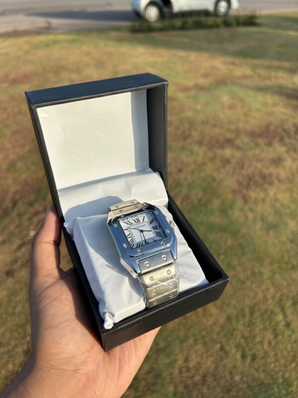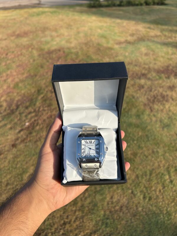 Cartier Santos Stainless Steel Watch – Classic Roman Dial with Brushed Metal Bracelet